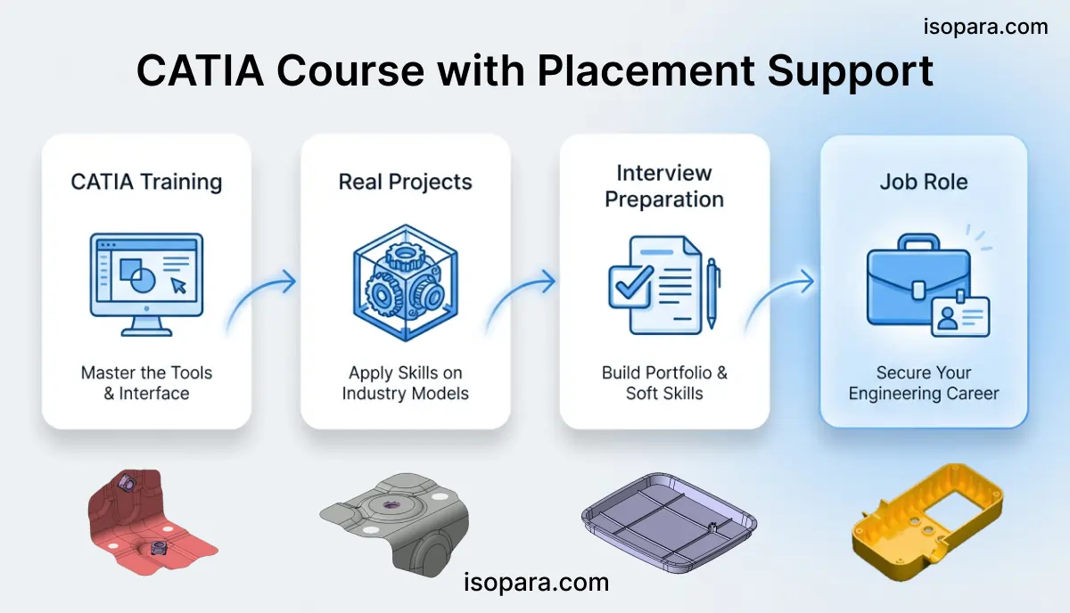 If your aim of learning CATIA is to get a job, then learning only software commands is not enough. This CATIA Job Oriented Course is designed for learners who want practical skills, real industry exposure, and a clear direction toward employment. At Isopara, we focus on CATIA Job Oriented Training that reflects how CATIA is actually used in companies. The CATIA Course with Placement support helps learners prepare for interviews, technical rounds, and entry-level
